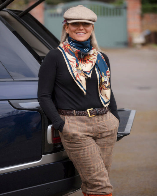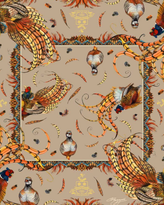 Heads or Tails Khaki Large Square Silk Scarf by Clare Haggas – Luxury Game Bird Design