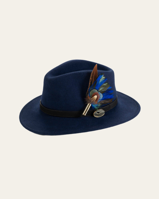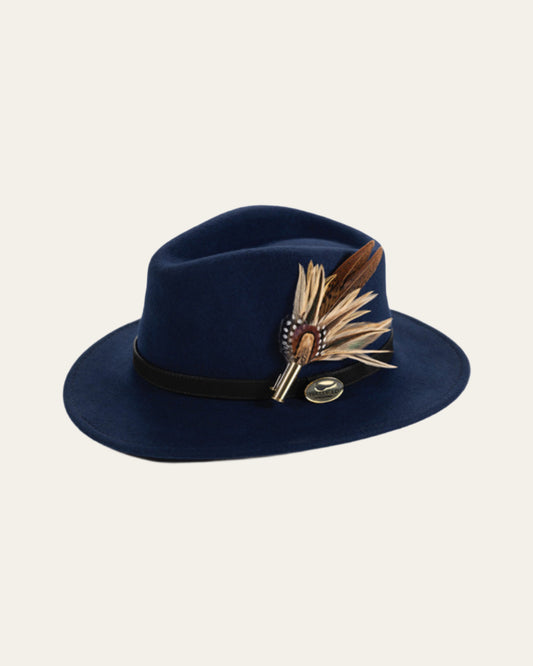 Navy Blue Felt Fedora with Pheasant Feather Wrap