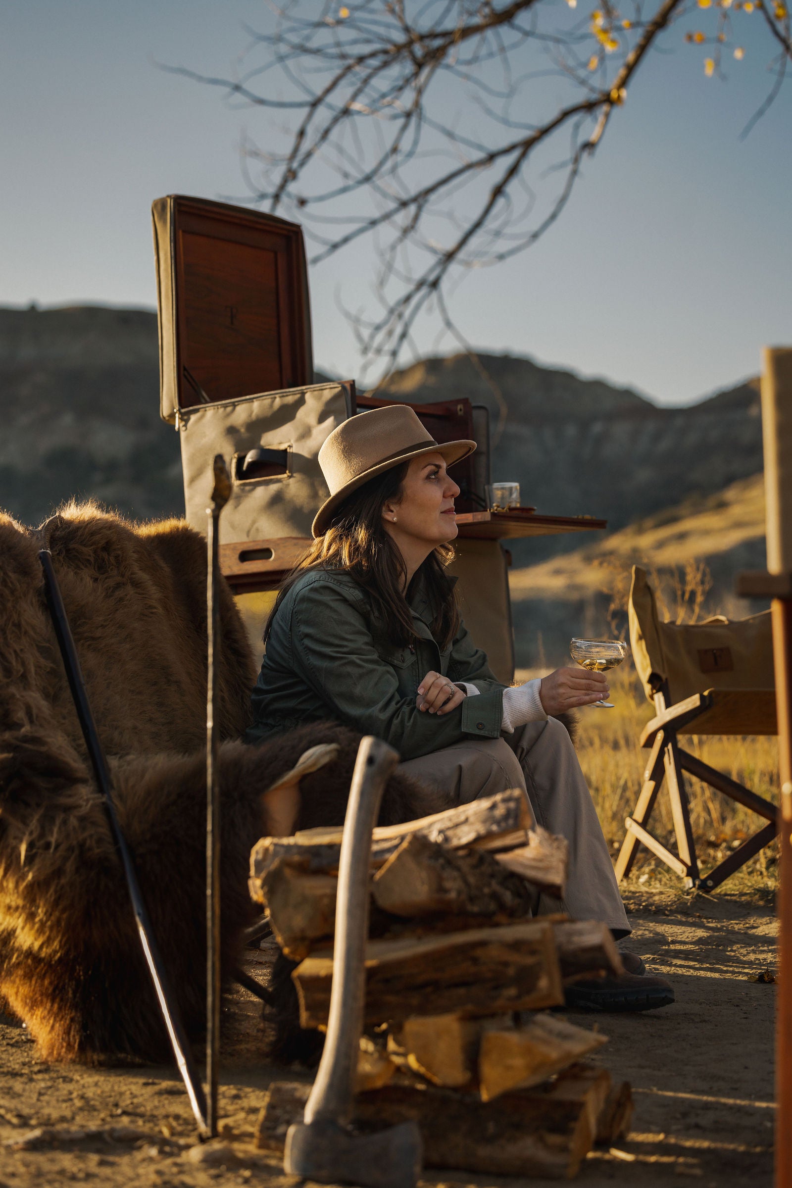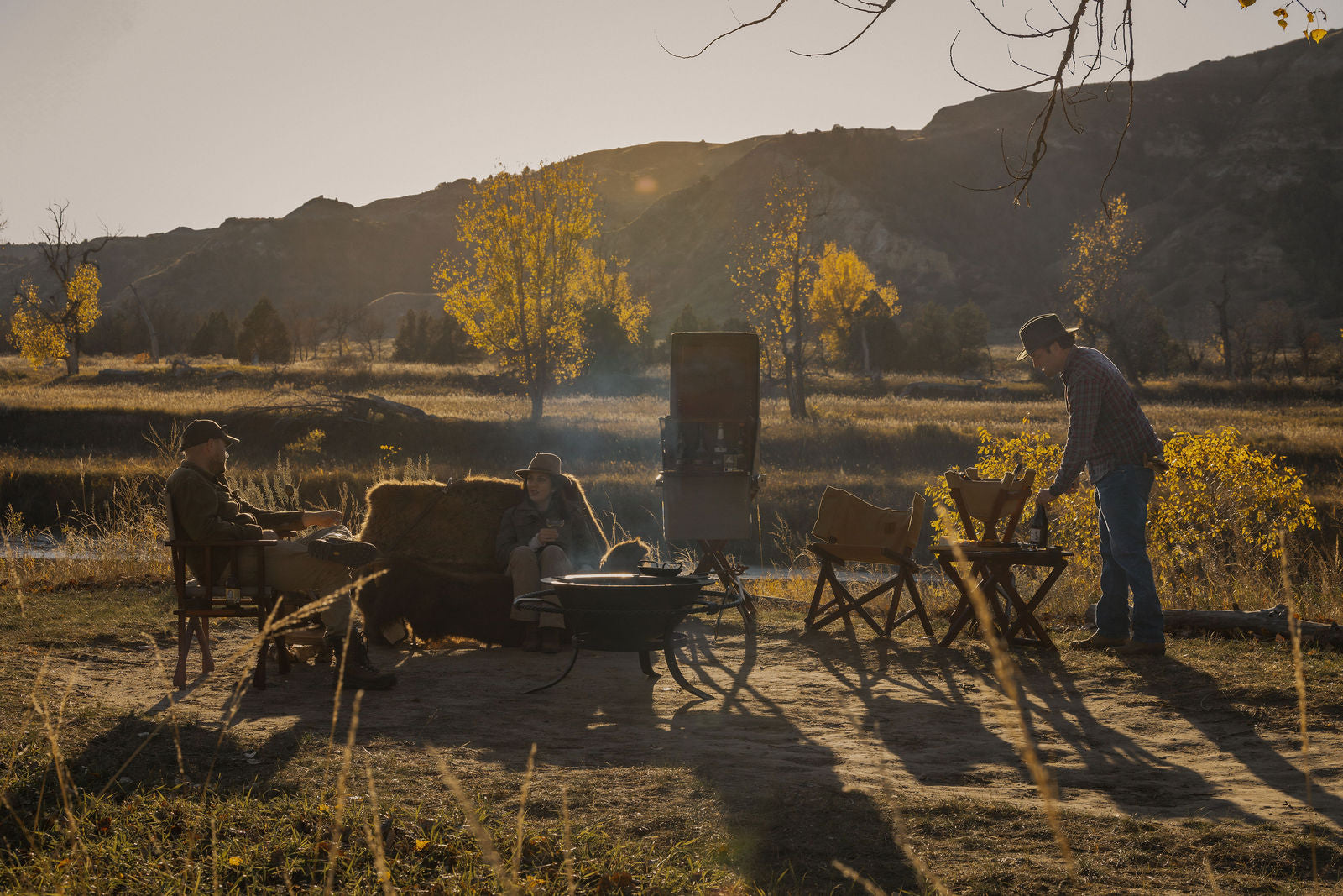 A considered field setup built for long days outdoors, combining furniture, fire and function to create a natural gathering point for cooking, eating and resting.