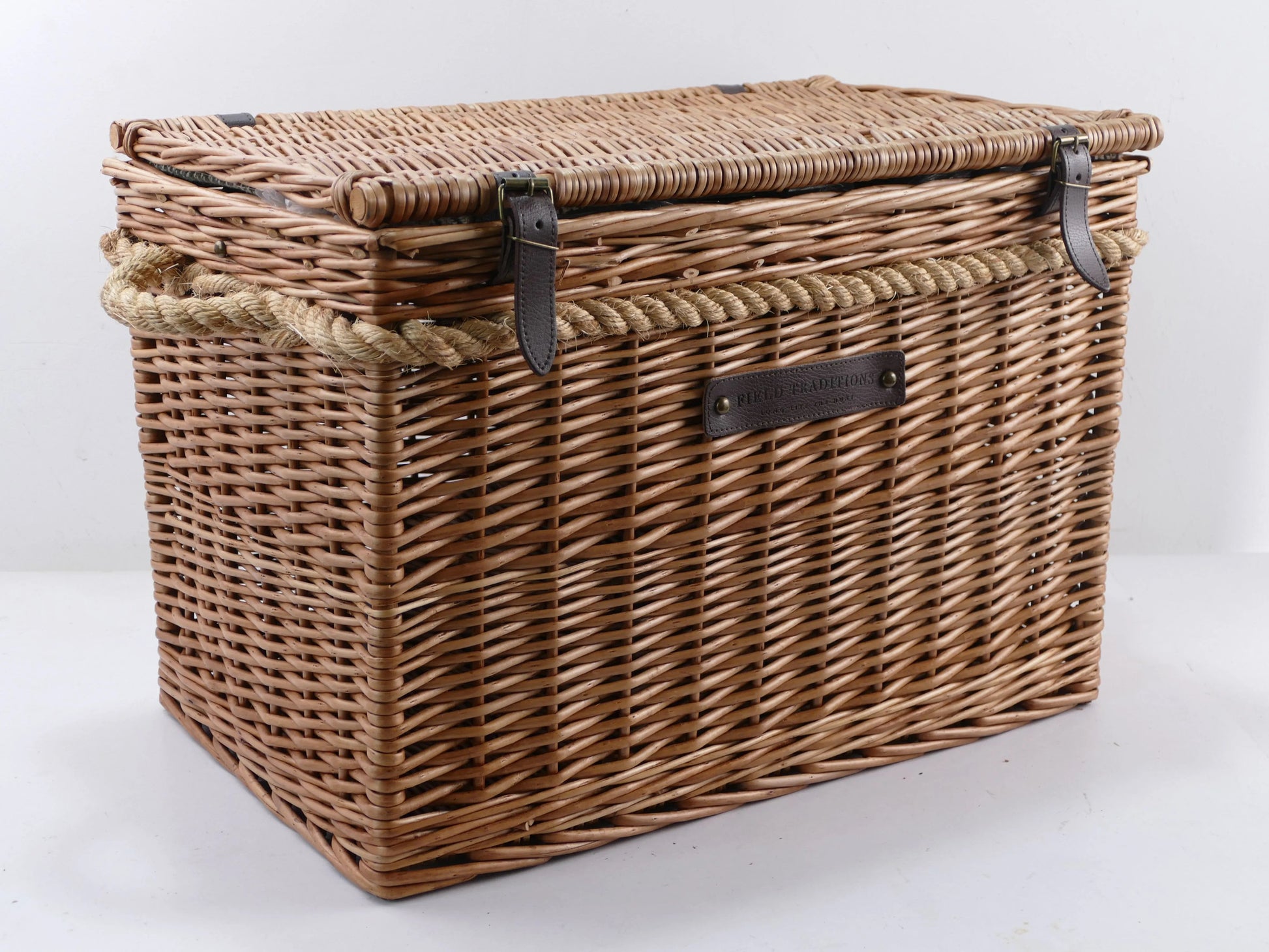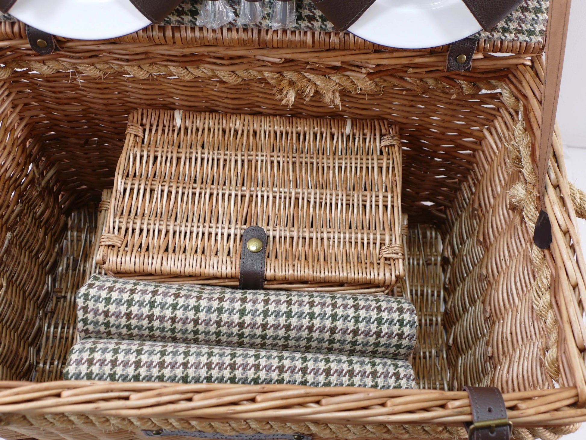 Create unforgettable outdoor moments with the Field Traditions 6 person Deluxe Houndstooth Picnic Basket with Rope Handles. Expertly crafted, this luxurious willow picnic basket embodies classic British elegance with a modern touch. Wrapped by by rich brown leather fasteners, offering both style and durability for countless picnic adventures.