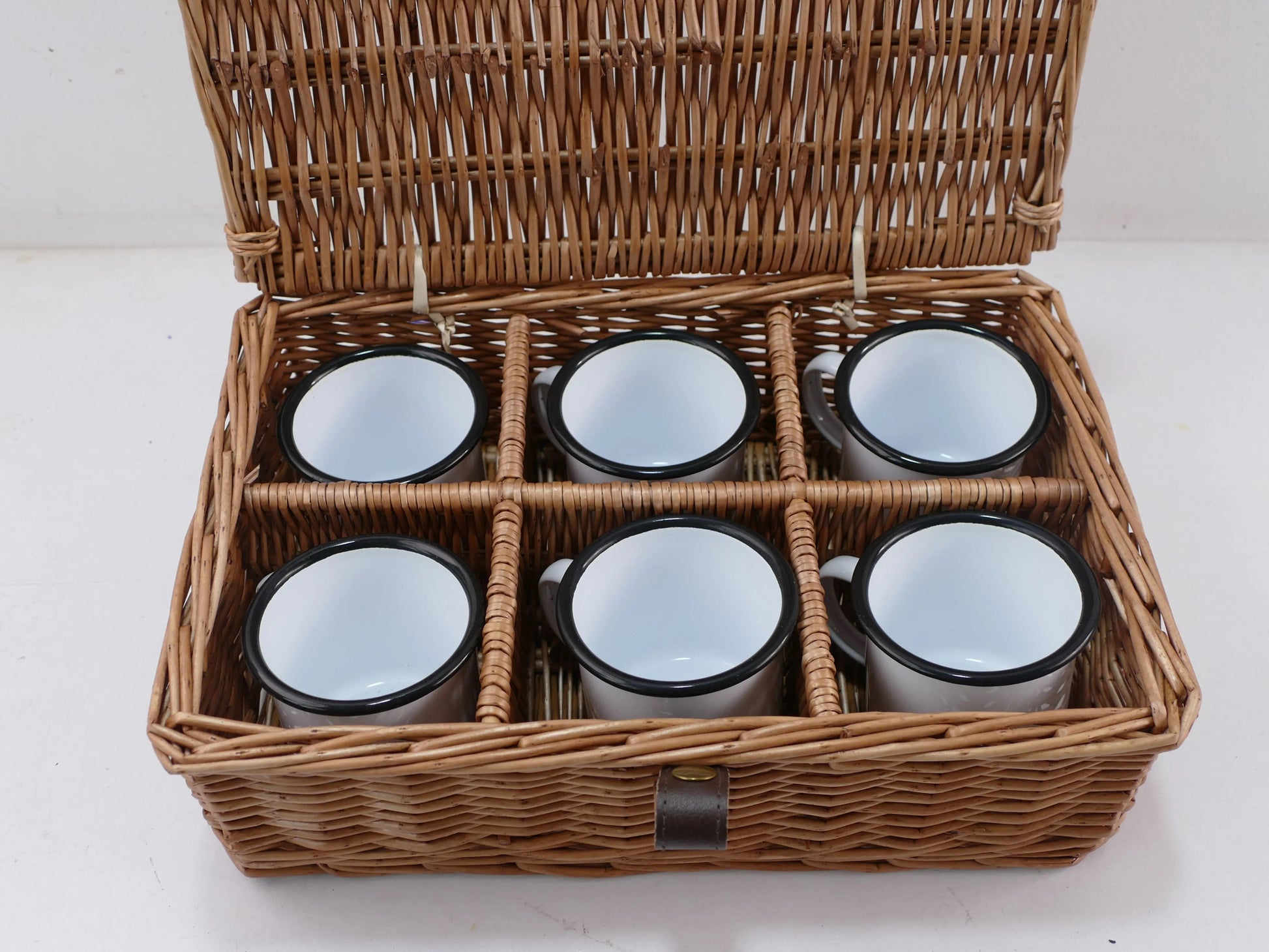 - 6 enamelware cups in removable basket