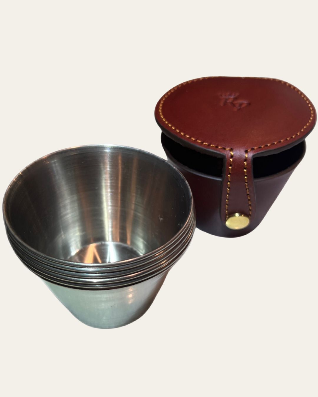 Elevate your outdoor adventures and gatherings with the Luxury Alcon 6-Cup Set with Premium Leather Snap Case. Handcrafted in Spain by master artisans, this exquisite set of Rey Pavon aluminium tumblers is encased in rich chocolate-coloured cowhide leather, offering both style and durability for a lifetime of use. The vegetable-tanned leather is crafted from 100% top-quality cowhide, ensuring a luxurious finish that only improves with age.