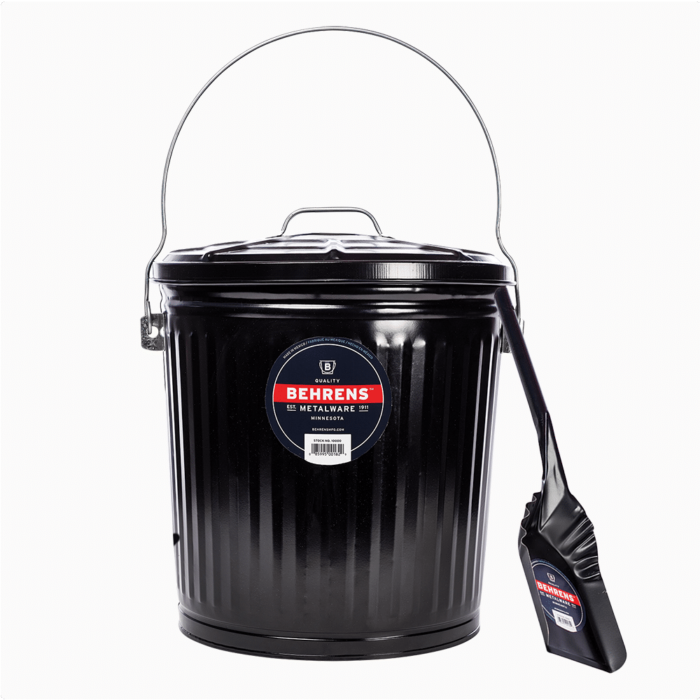 - Behrens' 7.5 gallon black painted galvanized steel ash pail features an offset bottom to keep the pail off the ground, a durable wire handle for easy portability, and corrugation to add strength.