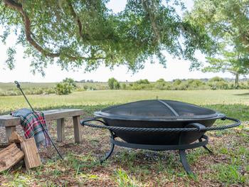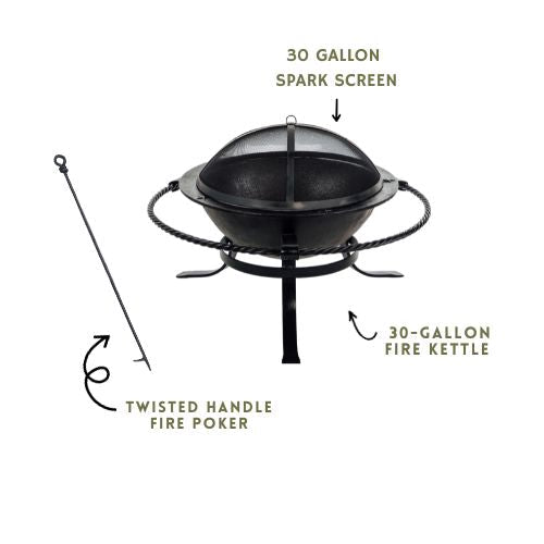 Includes the 30-Gallon Fire Kettle & Boot Rail Stand, 30-Gallon Spark Screen, and Twisted Poker.