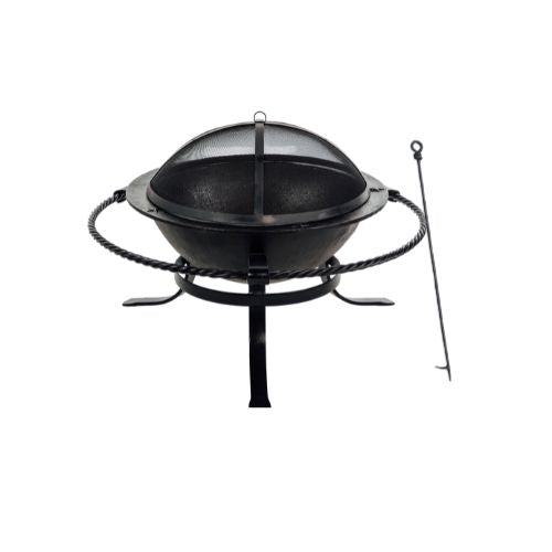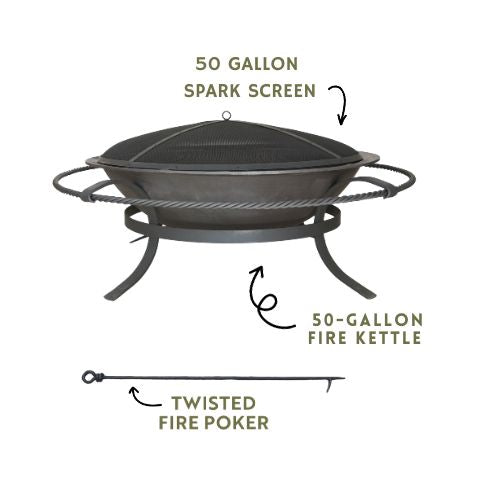 - Includes the 50-Gallon Fire Kettle & Boot Rail Stand, 50-Gallon Spark Screen, and Twisted Poker.